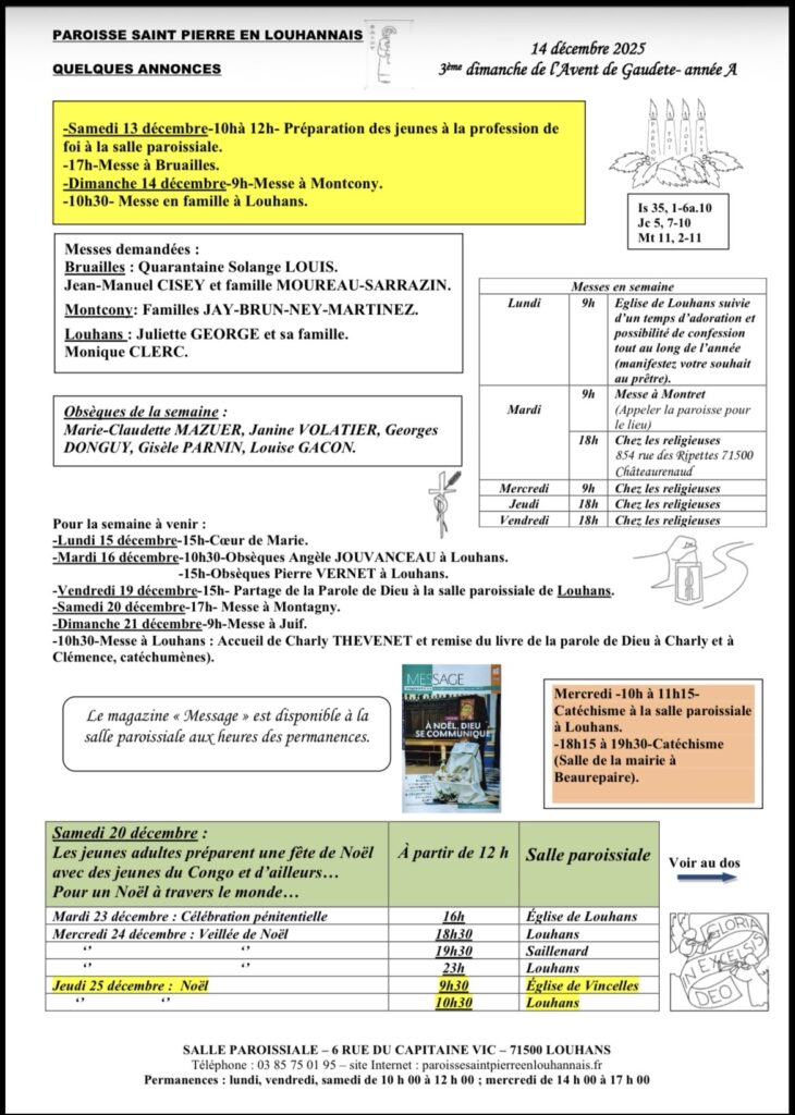 Vous trouverez ici la feuille d’annonce de la semaine ainsi que les renseignements sur les différentes propositions de la paroisse.